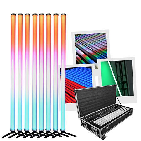 El paquete también incluye un juego completo de accesorios, que incluye 16 clips, 8 controles remotos IR, 16 adaptadores DMX, 16 ojales, una estación de carga, 8 placas con omega y 8 trípodes de suelo. Esta amplia gama de accesorios hace que el evolite Magic Tube Set sea extremadamente versátil y fácil de instalar en diversas configuraciones.