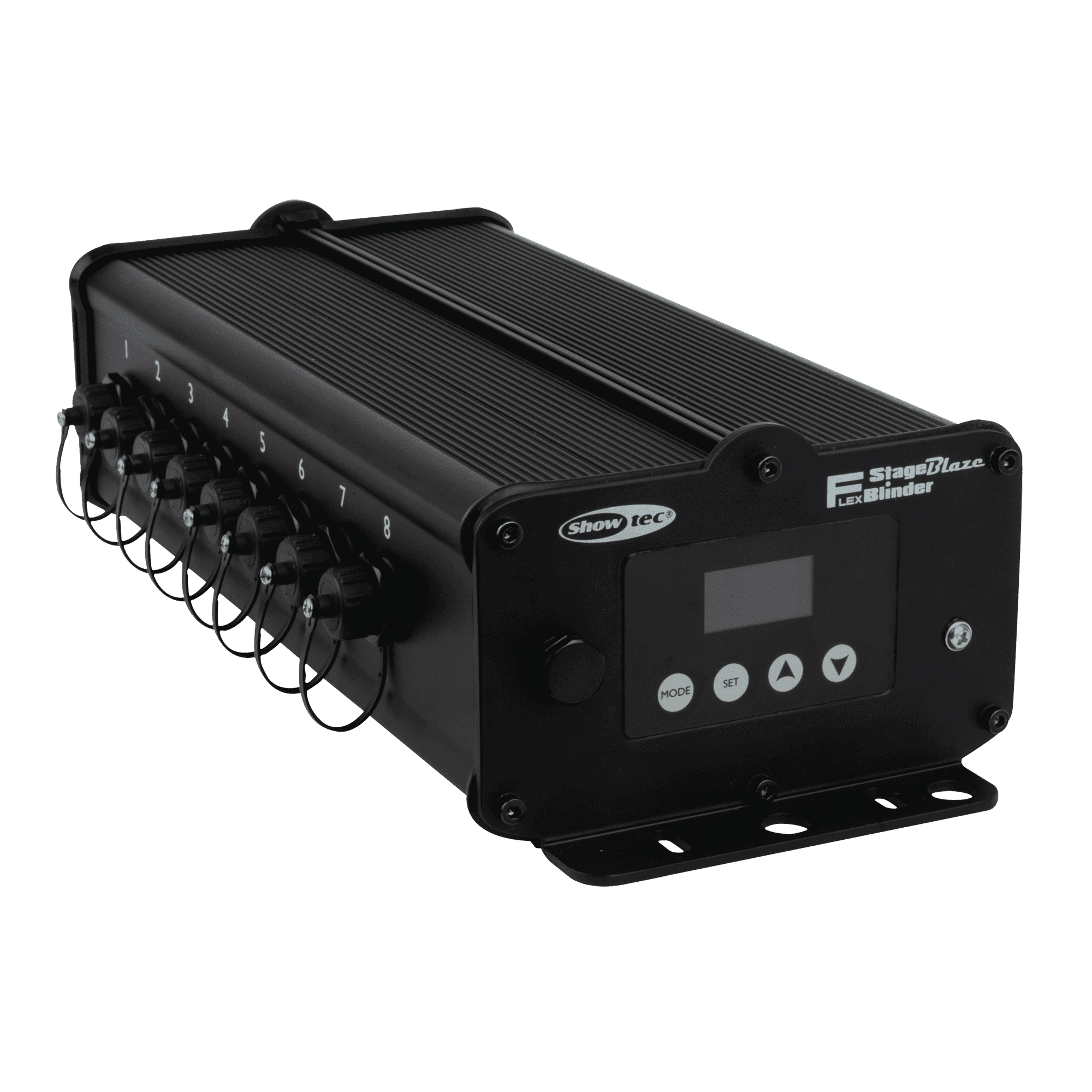Showtec Stage Blinder FLEX Blaze Controller es un controlador dedicado con clasificación IP65 que puede controlar hasta 8 unidades del Showtec Stage Blinder FLEX Blaze Single Pod. El controlador le permite obtener un control total sobre todas las funciones del Stage Blinder FLEX Blaze Single Pod. Se puede controlar mediante DMX/RDM, maestro/esclavo, y puede funcionar en modo autónomo con varios preajustes incorporados.