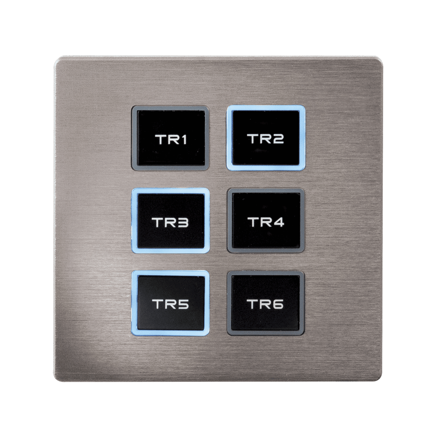 El Control remoto de pared para TR-512 Install está diseñado para encajar en una caja empotrada U40 para una instalación fácil y visualmente atractiva. Está disponible con un panel frontal de color negro o plateado.