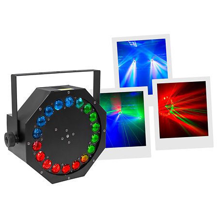 Compacto, ligero y muy económico, el set de luces Mac Mah Mega UFO-LZR combina tres dispositivos en uno. Sus LED RGBW de altísimo brillo producen haces de luz multicolor giratorios, así como un efecto de panal de abejas, mientras que el láser multipunto rojo y verde realza la atmósfera al usarse con una máquina de humo.