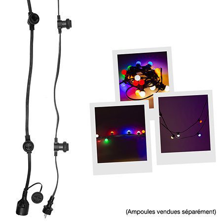 Muy fácil de usar, esta mágica decoración luminosa se entrega con un cable profesional (2 x 1,5 mm² VDE) de 10 metros, negro y discreto, decorado con 20 puntos de fijación para las bombillas LED tipo E27 incluidas en este pack. ¡