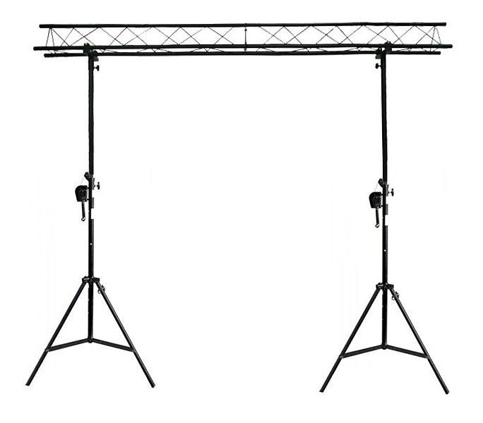 • 2 trípodes de acero negro + 2 barras en T añadidas en la parte superior para colgar más luces + truss central de 3 m (2 x 1,50 m)