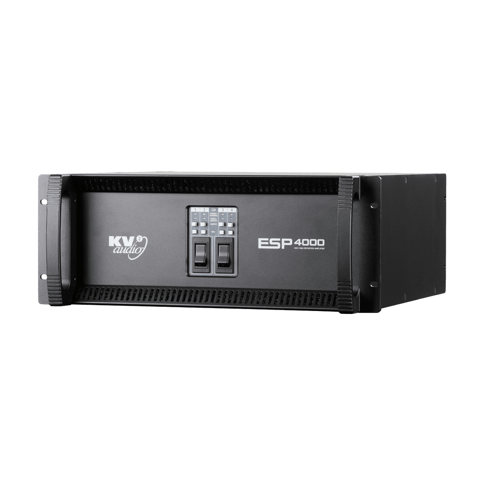 The ESP4000 is an ultra high definition 4 channel rack mountable power amplifier from KV2 Audio, specifically designed for optimised performance with ESD loudspeakers, as well as with other passive systems. For the ESP4000 all electronic circuit boards are first mounted on individual aluminium heat sinks, then on a secondary, internally sealed chassis, this leaves only the heatsink fins exposed. Two separate power supplies ensure increased reliability and continuous delivery of full power. Two shock mounted fans move air across the fins but never directly across the electronic components. This minimises maintenance cycles and improves the components lifespan and and reliability. The ESP4000 is housed in a professional 4U road rugged steel metal case with aluminium handles and evenly distributed weight.