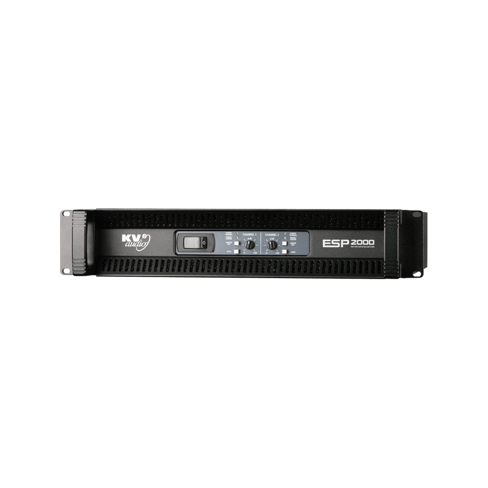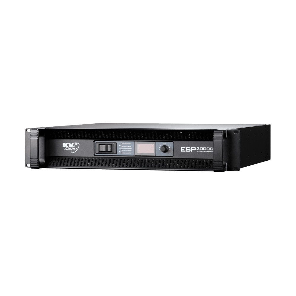 The ESP2000D is a two channel rack mountable power amplifier. The unit contains two separate 1000 watt amplifiers, two independent power supplies, (each channel running off each power supply), two signal paths, inputs and outputs as well as limiting and low frequency enhancement on each of the two channels within a two rack unit chassis. It can be used to power any range of passive loudspeakers as well as being specifically designed for optimised performance with KV2 Audio’s ESD Series. ESP2000D is now configurable via the front panel or remotely using KV2 Control & Diagnostics Tool.