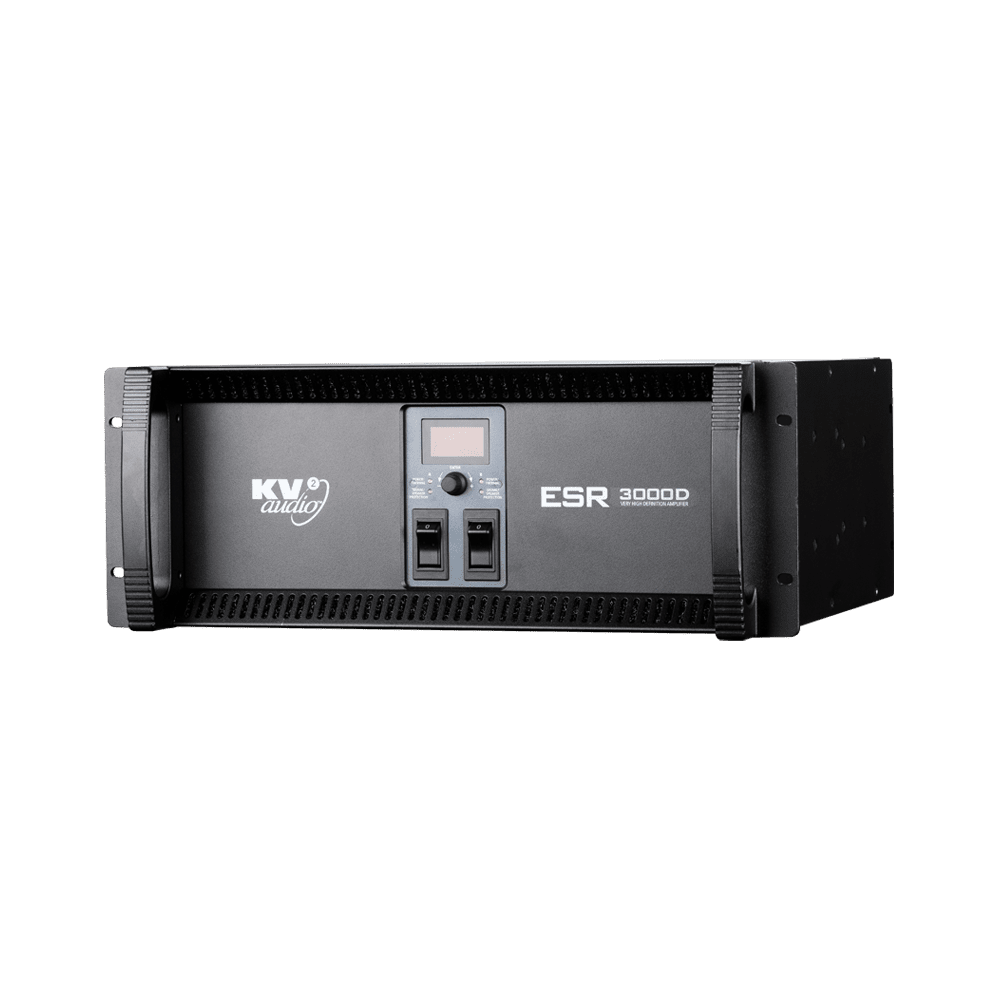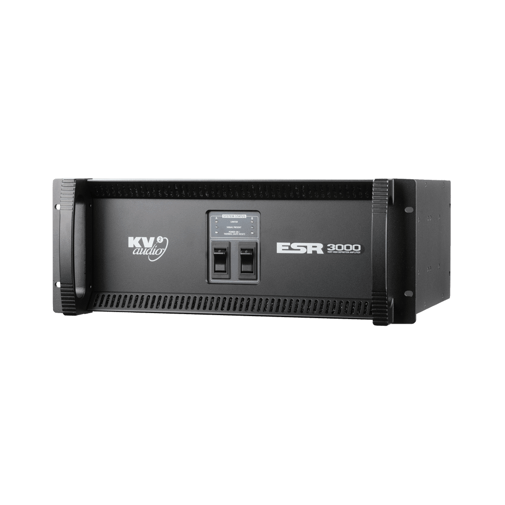 The ESR3000MkII is three-way, active control and amplification system specially designed for the KV2 Audio ESR full range series loudspeaker systems. It houses all signal processing and amplification, as well as providing control and crossover function an external subwoofer cabinet if needed utilizing an external amplifier. The ESR3000MkII powers the ESR215MkII. Each unit incorporates six amplifiers consisting of two 100-watt, Class AB, push pull, low intermodulation amplifier for high frequencies, two 200-watt, Class AB, push pull, low intermodulation design for mids and two a 1000-watt, high-efficiency, current- enhancing switch mode technology amplifier for bass. The ESR3000MkII stereo configuration powers two ESR cabinets accordingly.