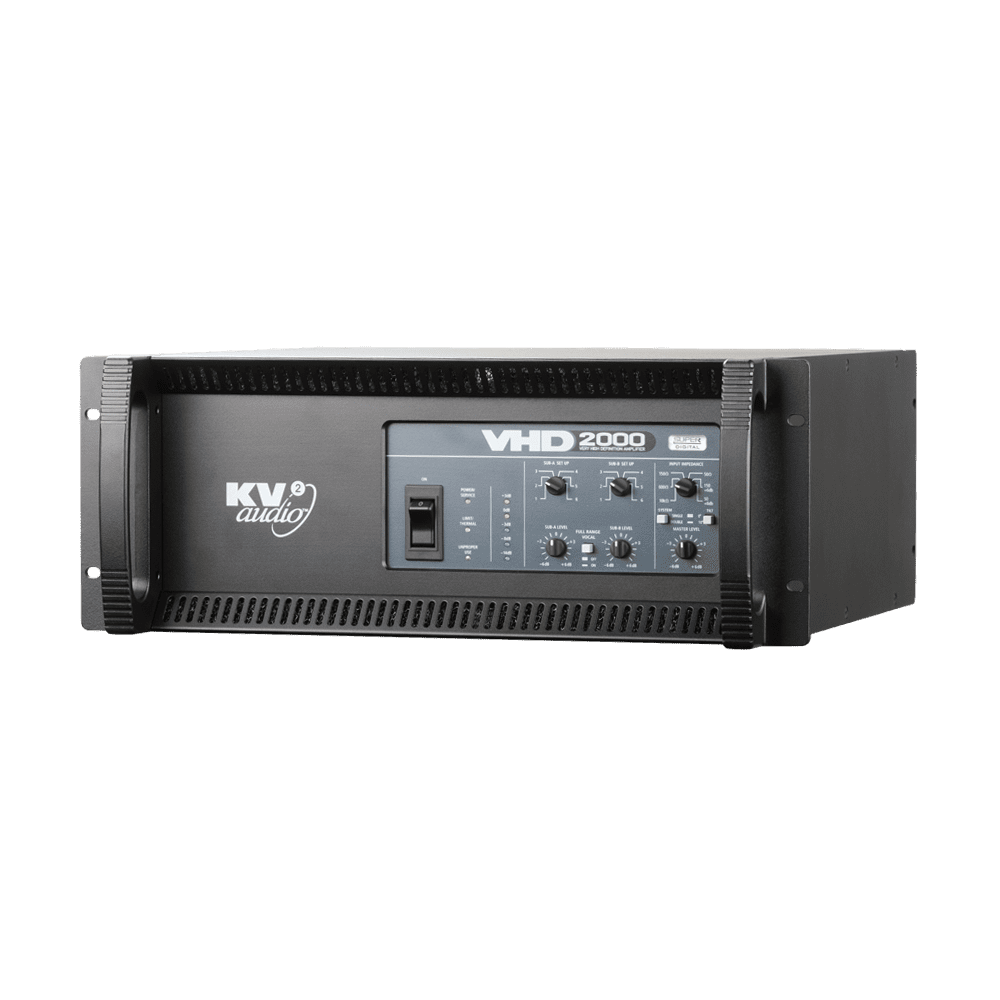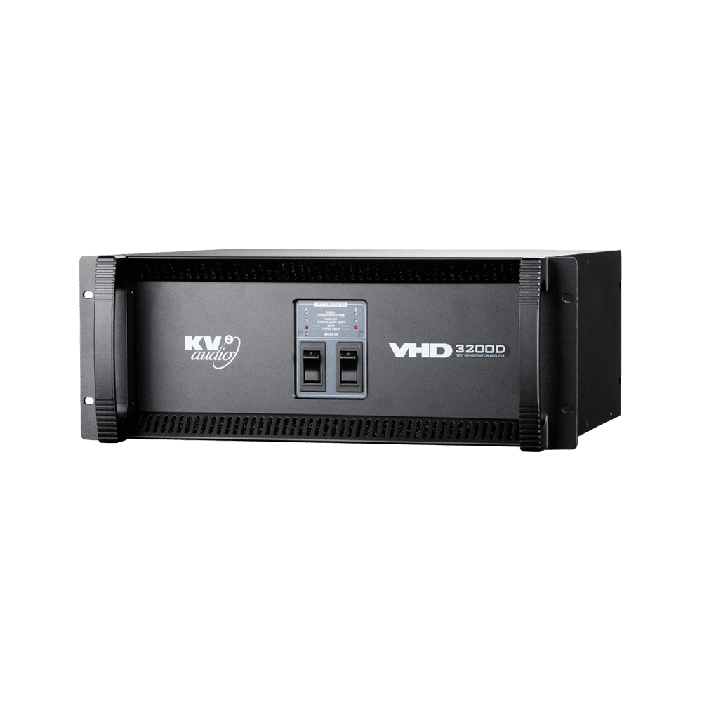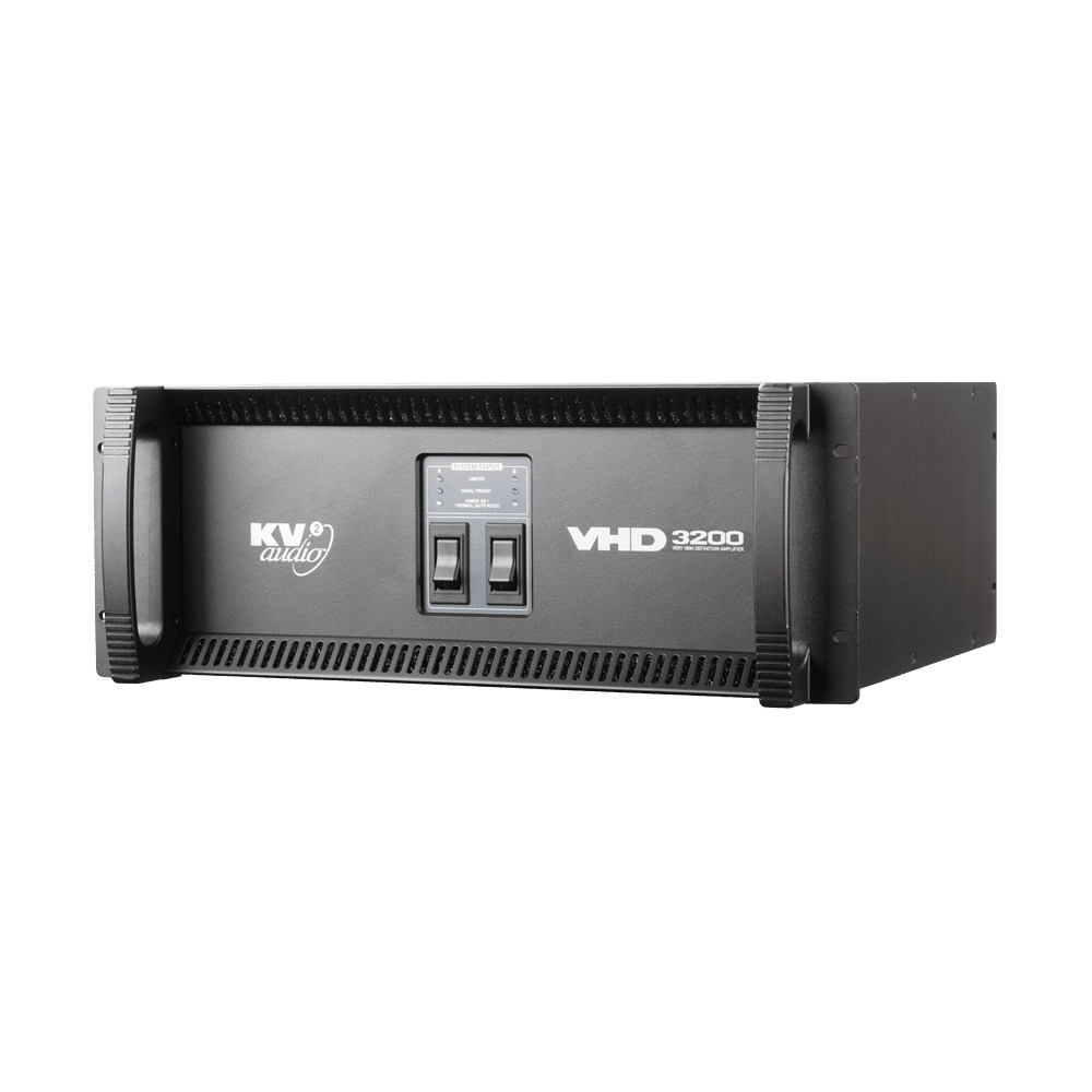 The VHD3200D is a rack mounted subwoofer amplifier. The unit contains two separate 1600 watt amplifiers with individual power supplies, signal paths and inputs and outputs within a single four rack space chassis. The unit can be used in bridged mode to provide full power for one channel mode. The unit acts as a slave for the VHD2000D, which provides audio and control signal. It can also be used with the EPAK2500/R when used in combination with KV2 Audio ES systems and power the associated ES subwoofer systems. The VHD3200D is now configurable remotely using KV2 Control and Diagnostics Tool.