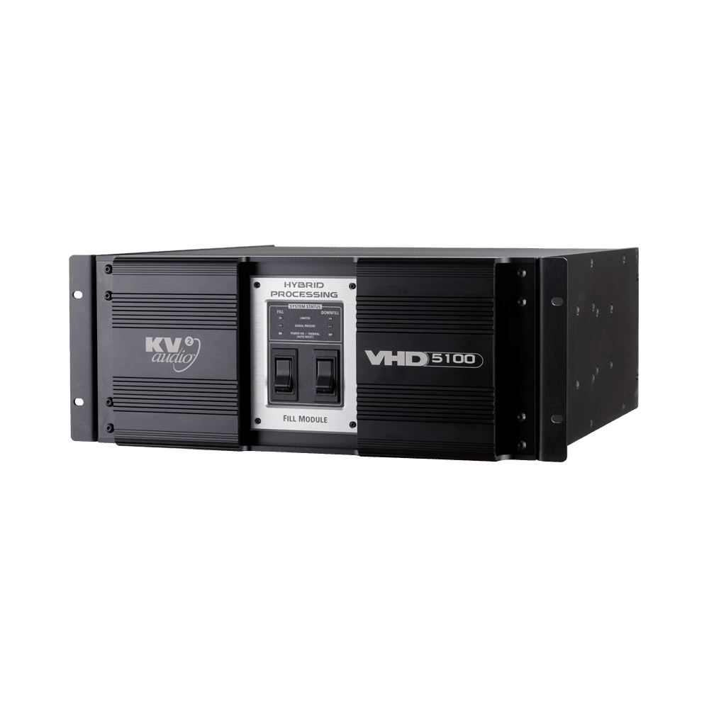 The VHD5100 is a two channel, three-way, active control and amplification system specially designed for the KV2 Audio VHD5.1 Downfill and ESR215MkII loudspeaker system. It houses all signal processing and amplification, as well as providing control and crossover function if needed utilizing a Fill channel external subwoofer. Each channel incorporates three amplifiers consisting of 100-watt, Class AB, push pull, low intermodulation amplifier for high frequencies, 200-watt, Class AB, push pull, low intermodulation design for mids and a 1000-watt, high-efficiency, current- enhancing switch mode technology amplifiers for bass.